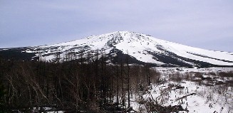富士スバルラインを上って行くに連れ富士山は間近に迫ってくる。 そして、いよいよ五合目近くになると富士山の姿はこんなに扁平な形になってしまった。 ![]()