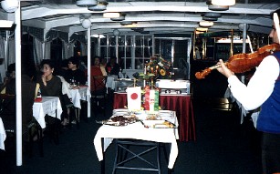 左は歓迎晩餐会での風景、右はナイトクルーズの船の中 心地よい酔いが異国情緒をいやが上にも高める シンバルやバグパイプ、オーストラリアのアボリジニが作るバンブーにも似た長い笛等の民族