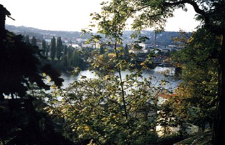 行き交い、川岸を散歩する人が小さく見えます。まさにスメタナの愛したモルダウの景色そのものの