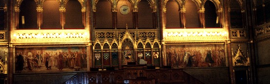 左はブタ地区の王宮に向かうケーブルカー 中の写真は建国の祖イシュトバーン王等の英雄をたたえた建国千年祈念碑 右は国会議事堂正面 ドナウ川の川沿いにある国会議事堂の金色燦然たる議会室 正面の両サイドには大きな絵が飾られている。 マジャール人はキリスト教が入ってくるまで、自然を崇拝する宗教だったと言います。自然崇拝