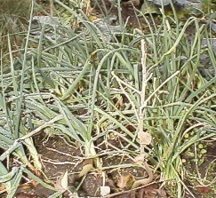 モロヘイヤの側ではミニタマネギが葉を伸ばしています。春の終わりに収穫をしたまま袋に