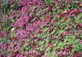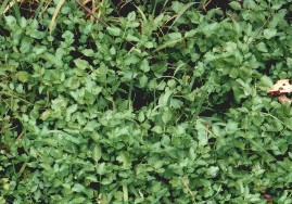 道縁の崖を覆い尽くしていたフユイチゴ、蛍の里の小さな流れに生えていた芹 途中から蛍の里である上峠地区に入っていきます。先日、下見で歩いた時より、もう周りの様子が変わっています。