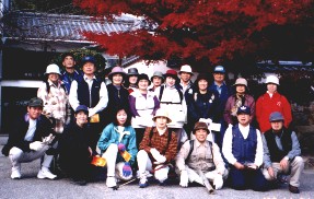 細い山道を歩く友歩会のメンバー、途中の紅葉がとてもきれいでした この道の突き当たりはT字路となっています。ここを左に折れると由加神社の方に向かいます。この道にも落ち葉が